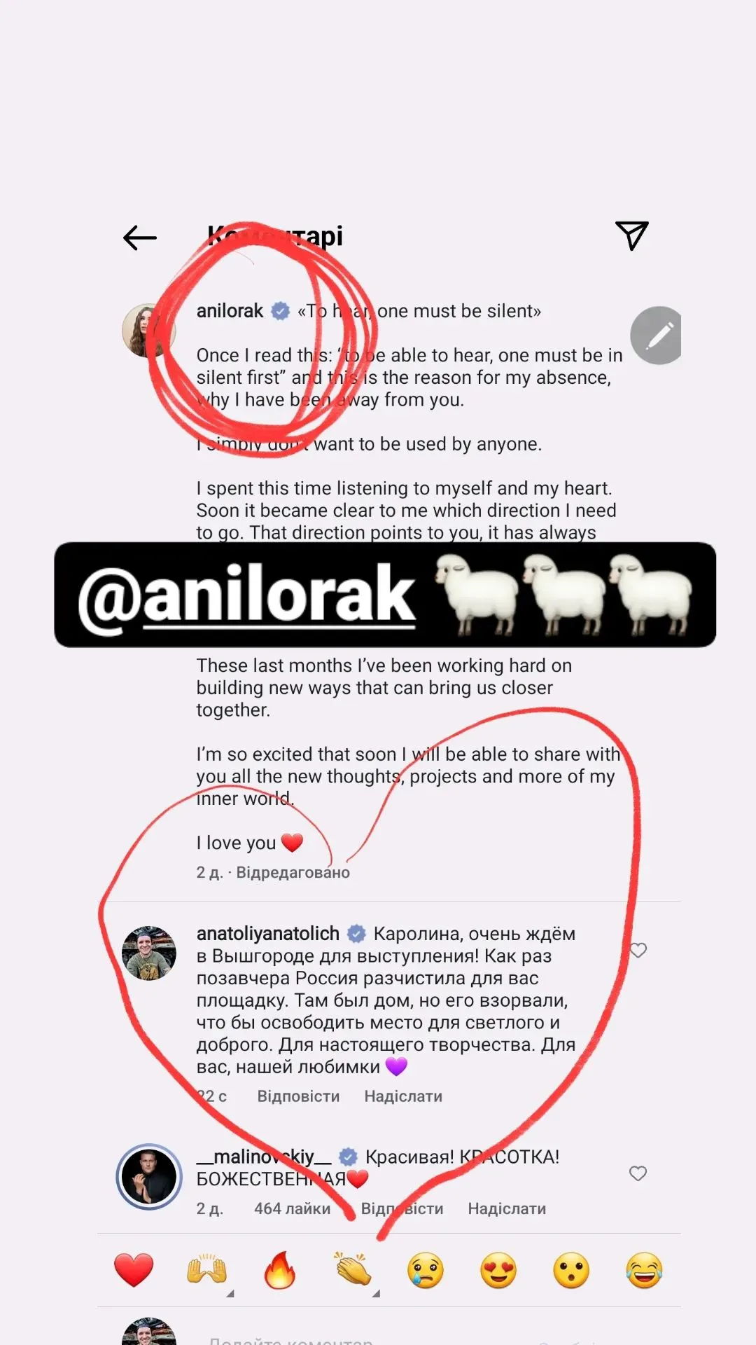 Зазначимо, до Ані Лорак Анатолій Анатоліч звернувся під постом, де та натякнула, чому мовчить про війну. Вона сказала, що "не хоче бути використаною ніким і нічим", тому на десятий місяць російського вторгнення вирішила далі творити як ні в чому не бувало. Крім того, гастролерка співає, бо так несе любов. На її думку, любов, а не перемога і мир, – "це все, що нам треба".