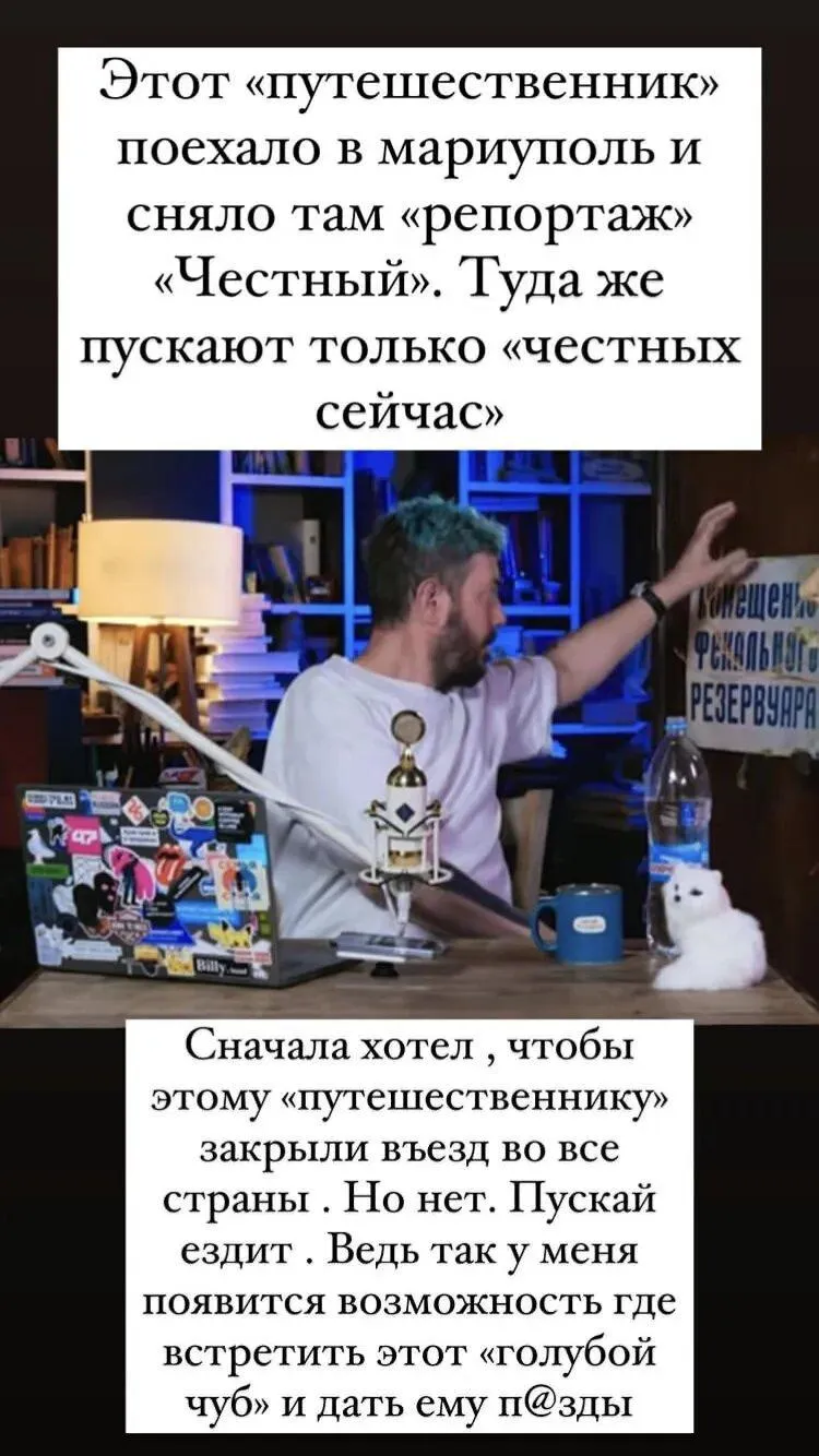 Цей "мандрівник" поїхало в Маріуполь і зняло там "репортаж" "Чесний". Туди ж пускають тільки "чесних" зараз. Спочатку хотів, щоб цьому "мандрівнику" закрили в'їзд у всі країни. Але ні. Нехай їздить. Адже так у мене з'явиться можливість десь зустріти цей "блакитний чуб" і дати йому п**ди,