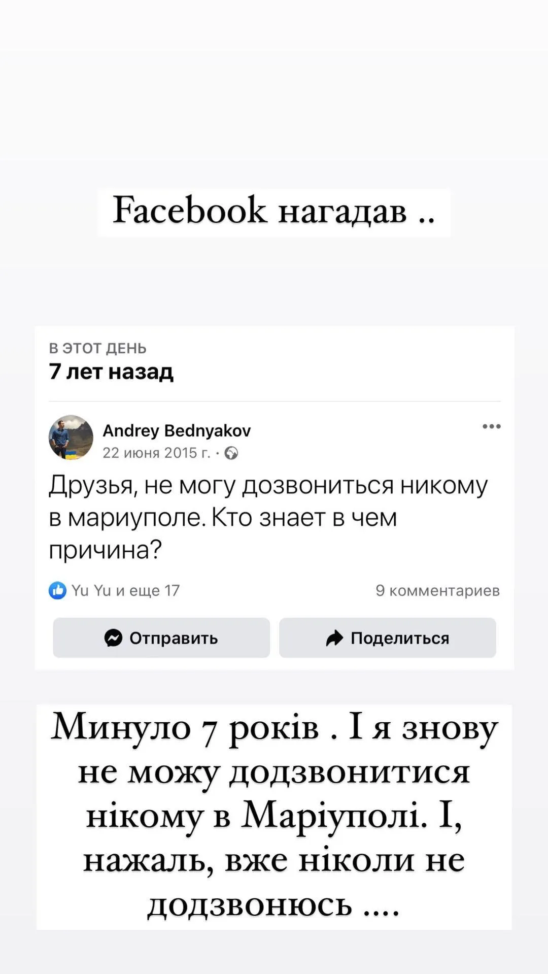 Також Андрій Бєдняков показав, що нещодавно фейсбук "нагадав" йому, як він 7 років тому не міг додзвонитись ні до кого у Маріуполі. "Минуло 7 років. І я знову не можу додзвонитися нікому в Маріуполі. І, на жаль, нікому вже не додзвонюсь".