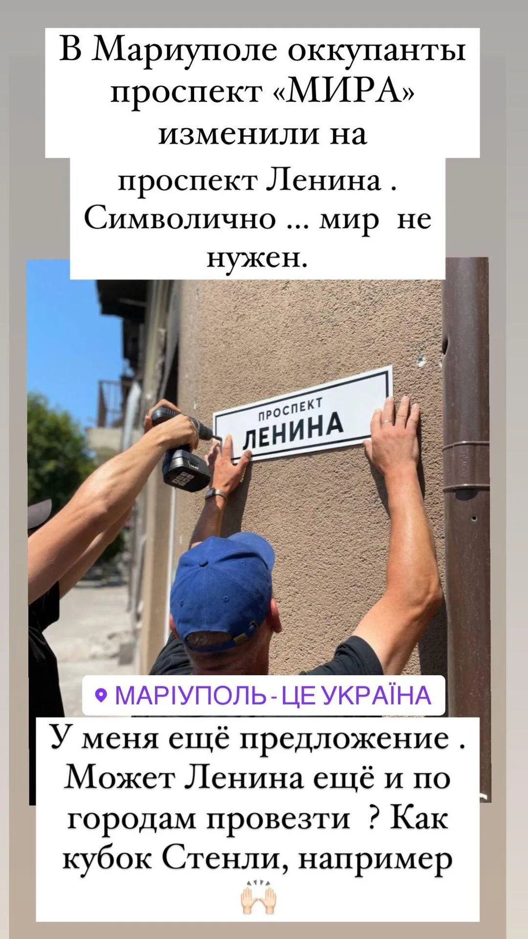У Маріуполі окупанти проспект Миру змінили на проспект Леніна. Символічно... мир не потрібен. У мене ще пропозиція. Може Леніна ще й містами провезти? Як кубок Стенлі, наприклад,