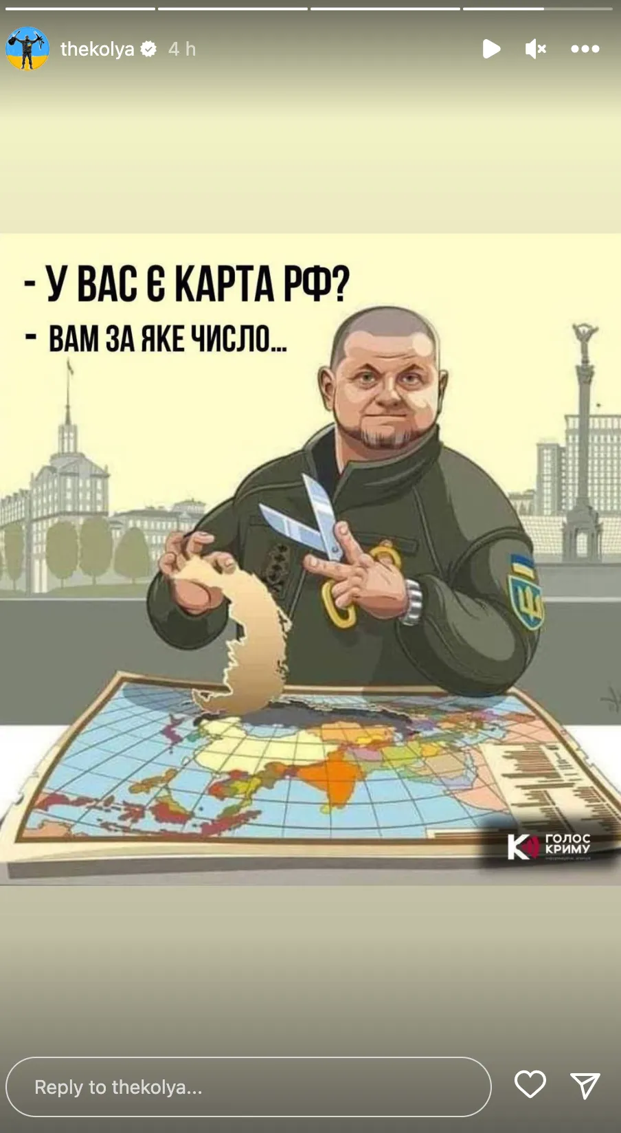 У сторіс артист також поділився цікавим мемом з Валерієм Залужним, у якому йдеться про "кордони Росії".