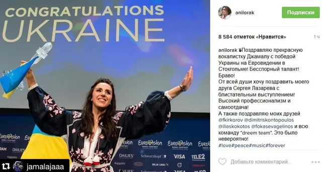 "Вітаю прекрасну вокалістку Джамалу з перемогою України на Євробаченні в Стокгольмі! Безперечний талант! Браво! Від щирого серця хочу привітати мого друга Сергія Лазарева з блискучим виступом! Високий професіоналізм і самовіддача!" — написала Ані Лорак.