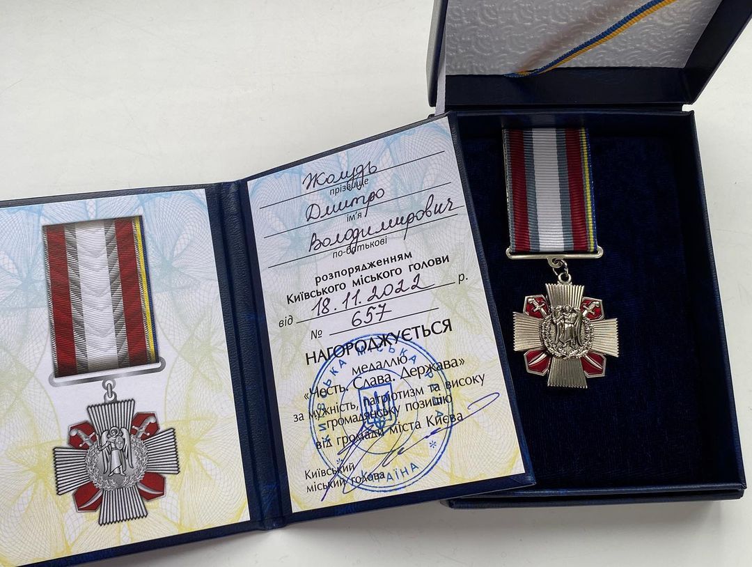 Від громади міста Києва – за мужність, патріотизм і високу громадянську позицію. Чітка та смілива громадянська позиція протягом усіх років війни, сотні врятованих життів, сумлінна служба в обороні рідних околиць Києва і захист країни на півночі Харківщини,
