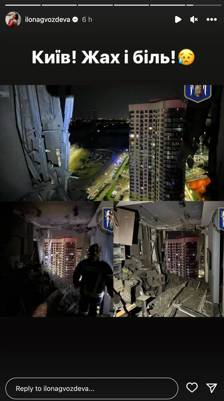 Зірка зараз перебуває на відпочинку за кордоном. Проте Гвоздьова теж не змогла оминути трагедію. У Інстаграм-сторіс танцівниця перепостила фото столичного будинку, який атакувала Росія. "Київ. Жах і біль", – написала вона.