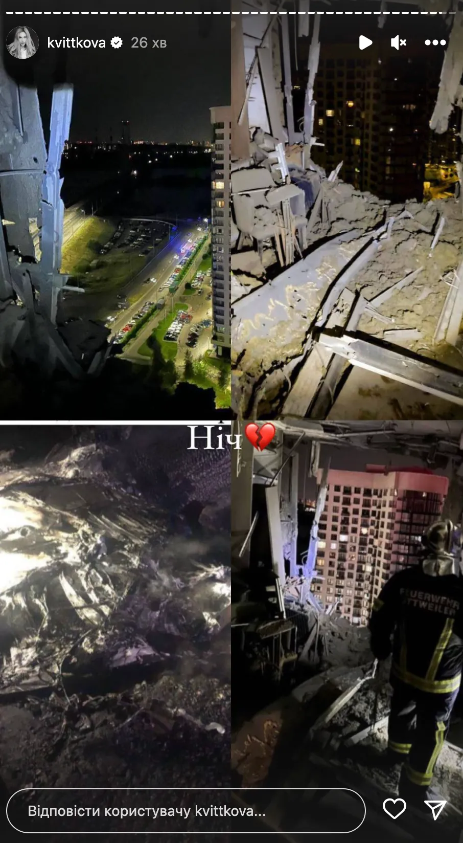 Блогерка у цей день святкує день народження сина. Але святковий настрій їм зіпсувала Росія. Квіткова зазначила, що світ має пам'ятати, що Росія – терорист. Вона також показала фото з місця удару.