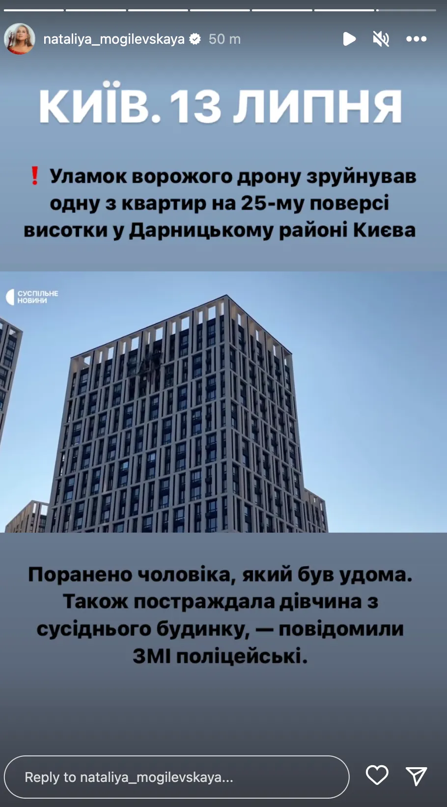 Співачка теж показала відео пошкодженого будинку. Вона повідомила, що уламок дрону знуйнував квартиру на 25-му поверсі висотки у Дарницькому районі Києва. "Поранено чоловіка, який був вдома. Також постраждала дівчинка з сусіднього будинку", – додала Могилевська.