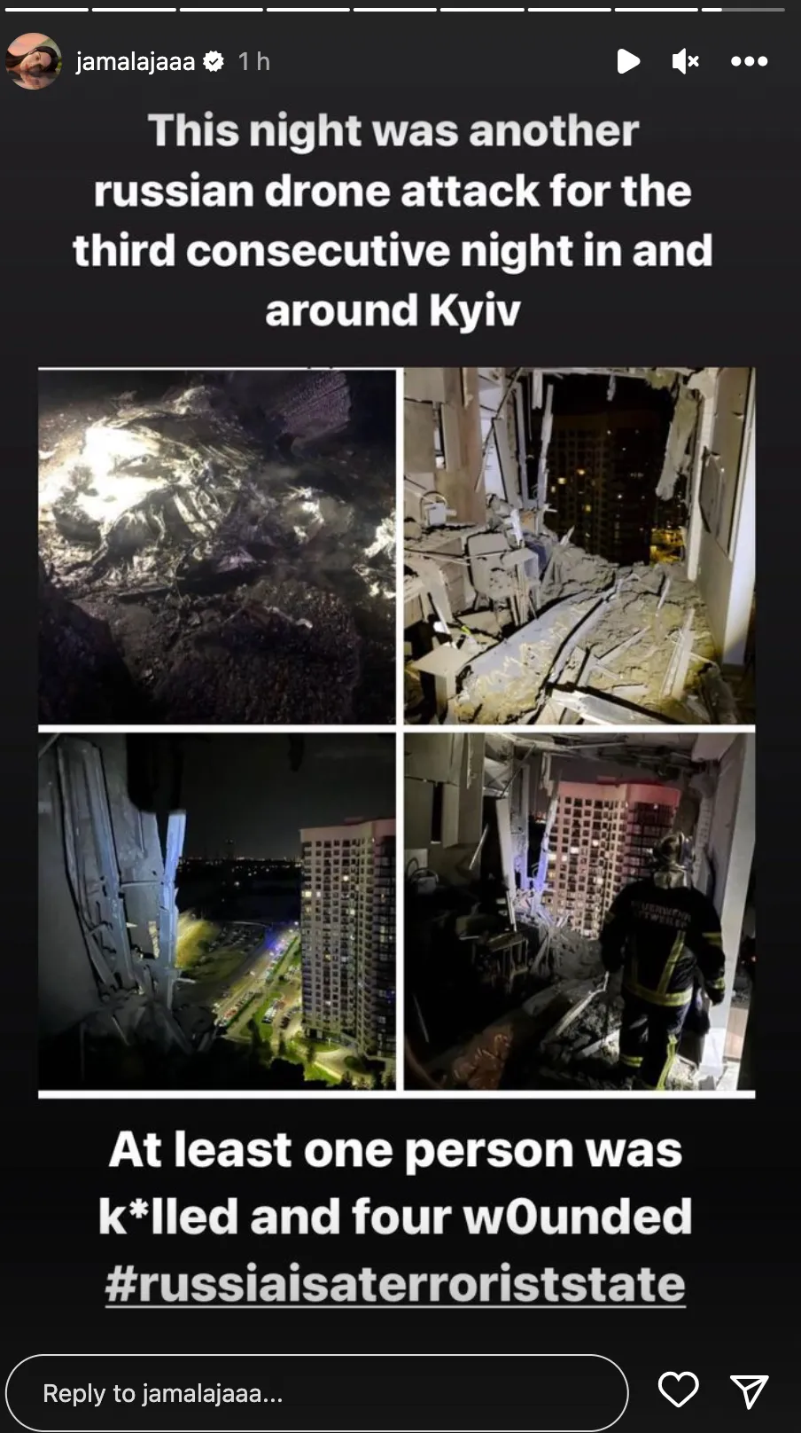 Зірка в Інстаграм-сторіс показала наслідки атаки Києва та додала опис англійською мовою, щоб це побачили за кордоном. Зокрема, Джамала зазначила, що через атаку загинув чоловік, ще 4 людей постраждали.