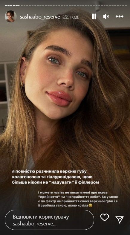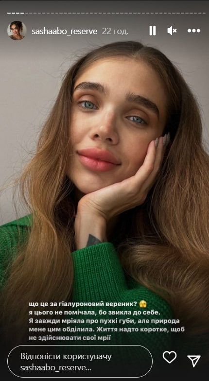 Здебільшого користувачі мережі негативно ставляться до пластичних операцій, критикують зірок, які наважуються на такі кроки. Однак цього разу Сашу Бо засипали компліментами. Блогерка зізналася, що справді не приймає свою верхню губу, через що вирішила змінити її, і підписники поставилися з розумінням.