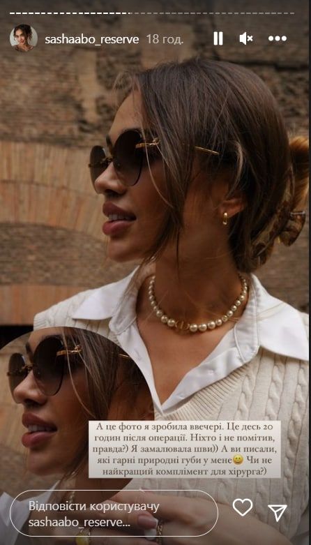 Цю операцію дівчині зробили в Італії. Підписники навіть не здогадувалися про втручання, поки блогерка сама не розповіла про це. Шви Саші знімали вже після повернення додому. Це зробив її чоловік Платон, який за освітою стоматолог.