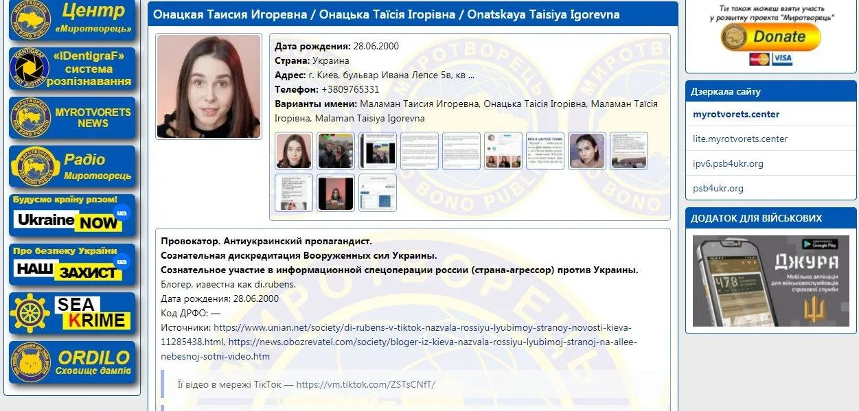 Популярна блогерка TikTok з нікнеймом di.rubens, яка раніше записала скандальне відео на алеї Небесної Сотні, потрапила в базу "Миротворець". Виявилося, що справжнє її ім'я – Онацька (Маламан) Таїсія Ігорівна.