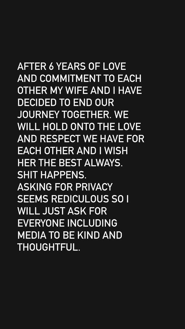 Після шести років кохання і відданості одне одному ми з дружиною вирішили завершити нашу спільну подорож. Ми будемо зберігати любов і повагу, які ми відчуваємо один до одного, і я бажаю їй завжди всього найкращого. Лайно трапляється,