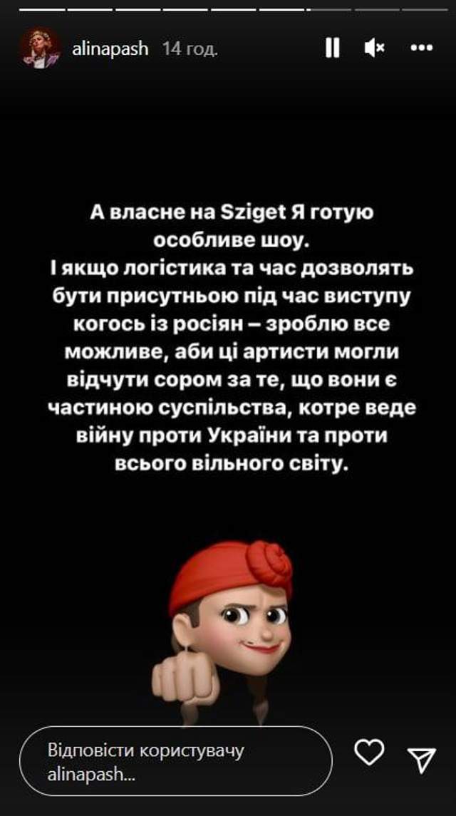 Alina Pash повідомила, що виступатиме на фестивалі Sziget, який відбуватиметься в Угорщині 10-15 серпня. Там також будуть російські артисти.