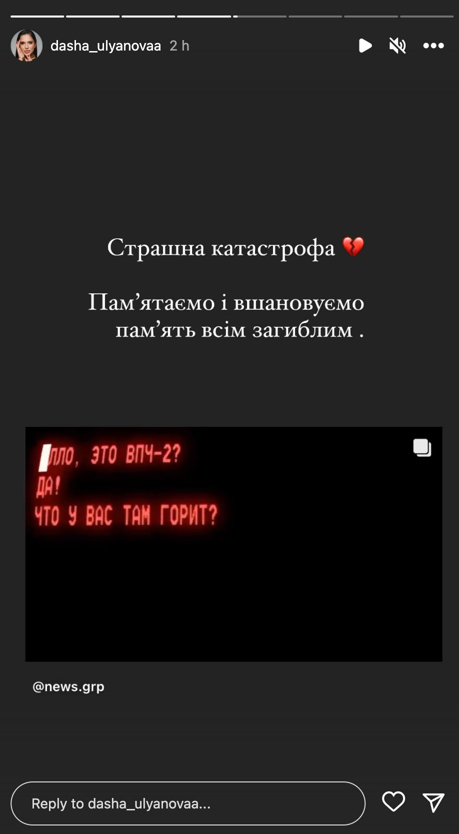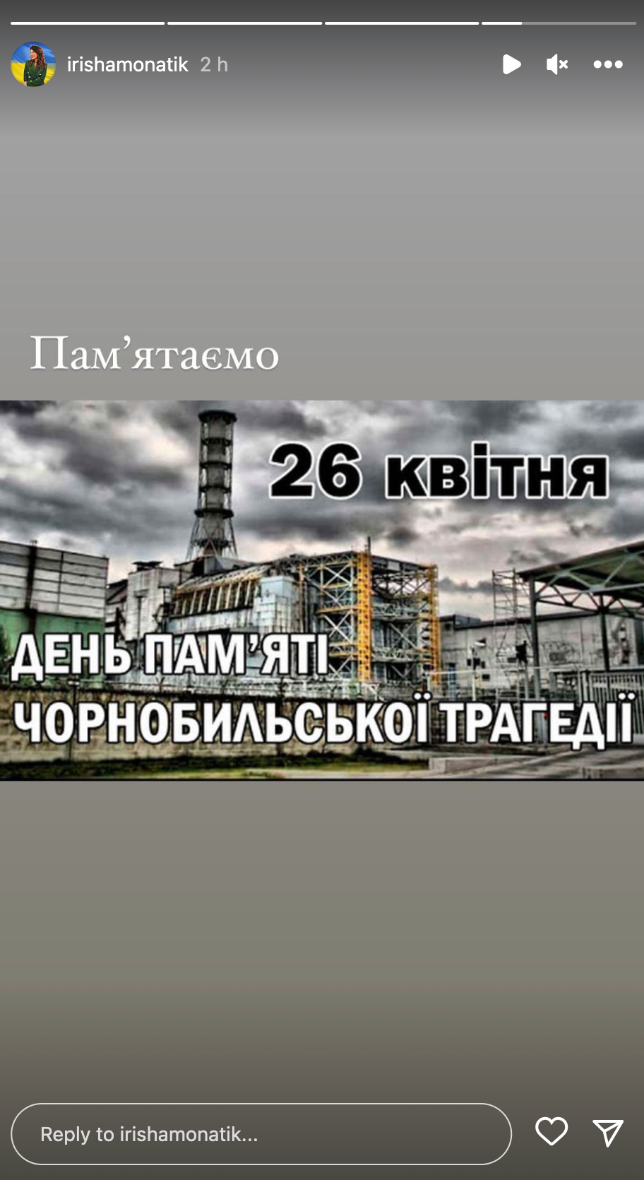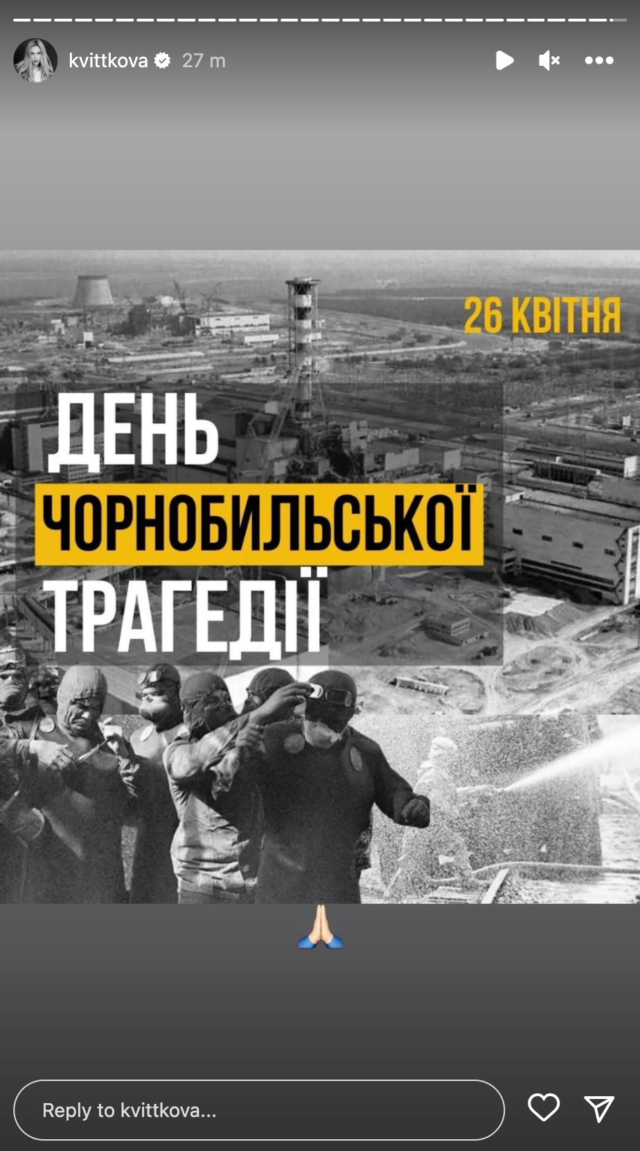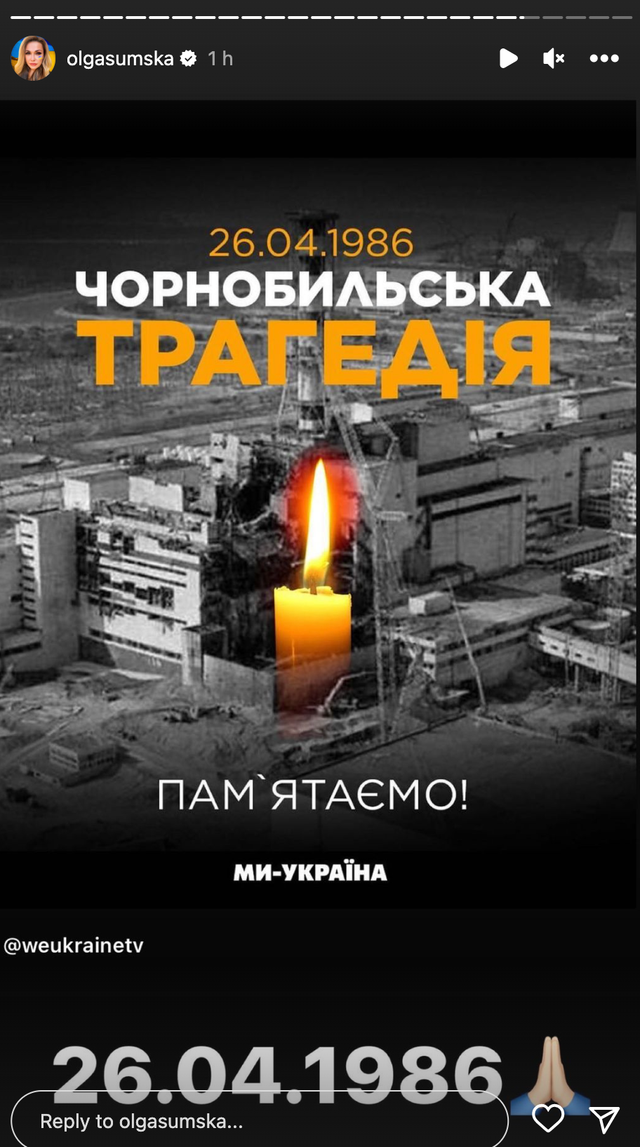 "Щоденні хвилини мовчання… Щоденні втрати найкращих… Все зараз тільки заради перемоги, а решта відходить на другий план. Проте мусимо пам'ятати всі етапи нашої історії, яка нажаль має аж занадто сумних дат… Сьогодні ми згадуємо ще одну трагічну дату – річницю Чорнобильської трагедії", – написала артистка