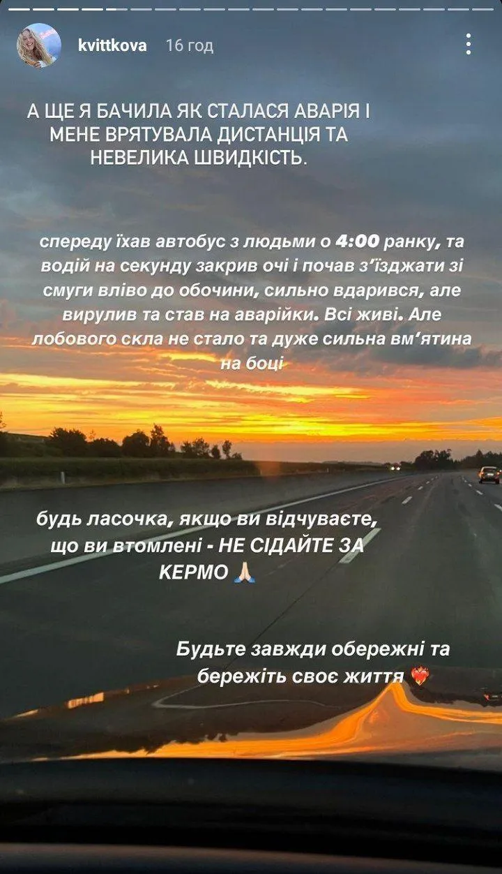 А ще я бачила, як сталася аварія, і мене врятувала дистанція та невелика швидкість. Спереду їхав автобус з людьми о 4:00 ранку, та водій на секунду закрив очі і почав з'їжджати зі смуги вліво до обочини,