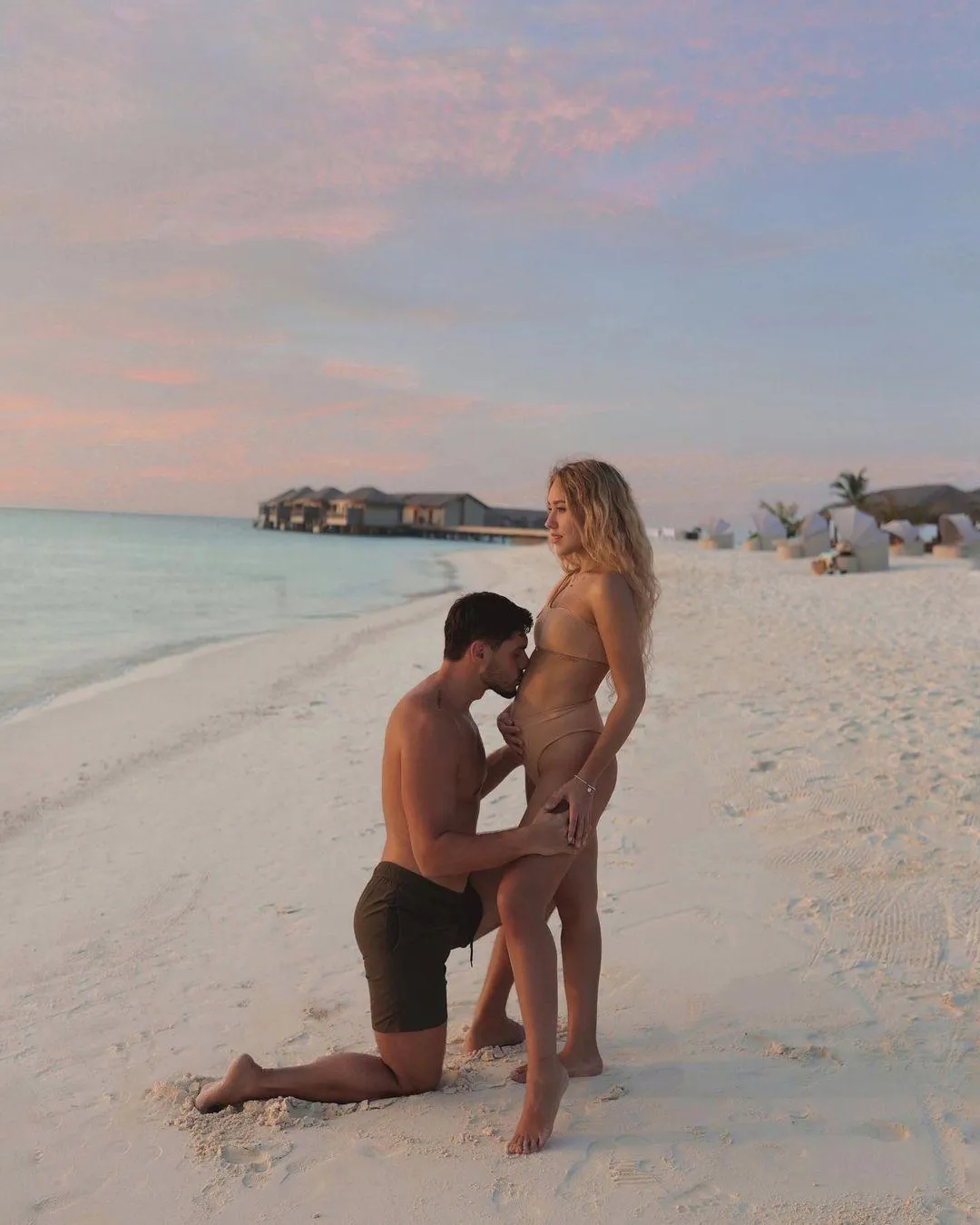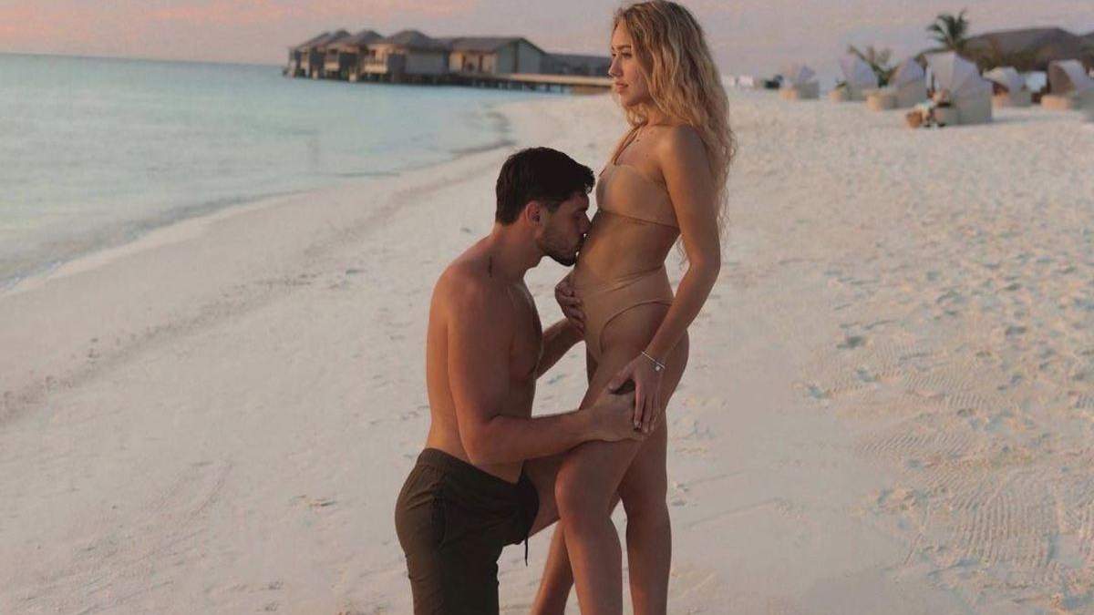 На світлині пара позує на березі океану. Нікіта стоїть на одному коліні й цілує вагітний животик дружини. Даша в бежевому купальнику дивиться вдалечінь.