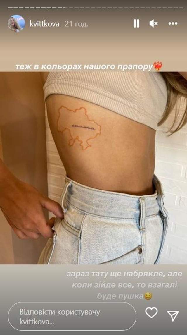 Після повномасштабного вторгнення Росії на територію України популярними серед українців стали патріотичні татуювання. Даша Квіткова тривалий час перебувала в Тернополі, але після повернення до Києва звернулася до свого майстра та також набила символічні тату.