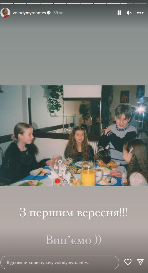 "Навчання для життя… світлого та гарного життя… Всіх із Днем знань! Діти, гарного вам навчального року, наскільки це тільки можливо в наших реаліях. Батьки, сил вам та терпіння. Вчителі, дякуємо вам за сміливість і жагу створювати наше яскраве майбутнє", – зазначив артист.