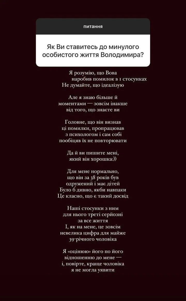 Я розумію, що Вова наробив помилок у перших стосунках. Не думайте, що ідеалізую. Але я знаю більше й моментами – зовсім інакше від того, що знаєте ви. Головне, що він визнав ці помилки, пропрацював з психологом і сам собі пообіцяв їх не повторювати,