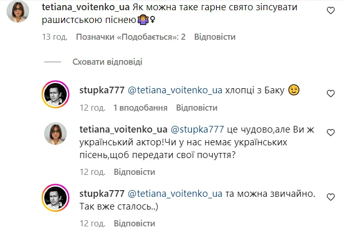 "Як можна таке гарне свято зіпсувати рашистською піснею?" – здивувалася одна з підписниць Ступки. Він відповів, що "хлопці з Баку", але дівчина продовжила: "Це чудово, але ви ж український актор! Чи в нас немає українських пісень, щоб передати свої почуття?"