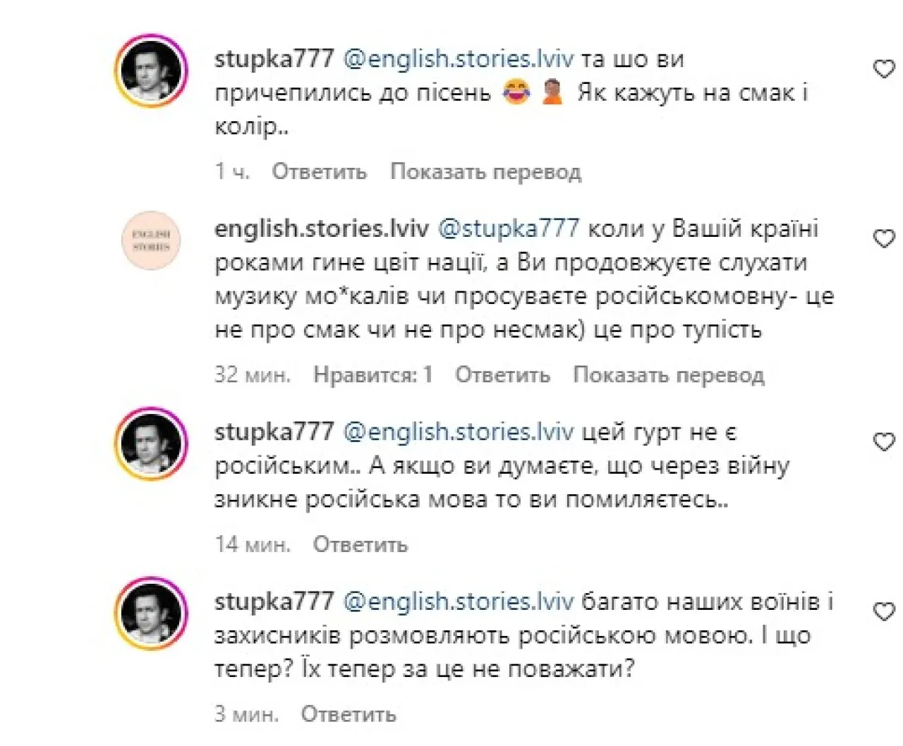 Та шо ви причепились до пісень. Як кажуть, на смак і колір… Цей гурт не є російським. А якщо ви думаєте, що через війну зникне російська мова, то помиляєтесь. Багато наших воїнів і захисників розмовляють російською мовою. І що тепер? Їх тепер за це не поважати?