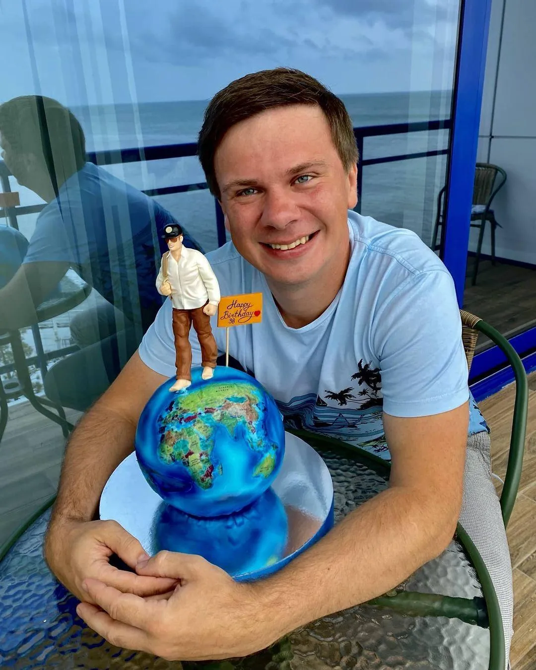Телеведучий поділився яскравим фото, де показав миловидний подарунок від Олександри Кучеренко. Кохана подарувала чоловікові торт у вигляді планети, по якій крокує фігурка Дмитра з рюкзаком.