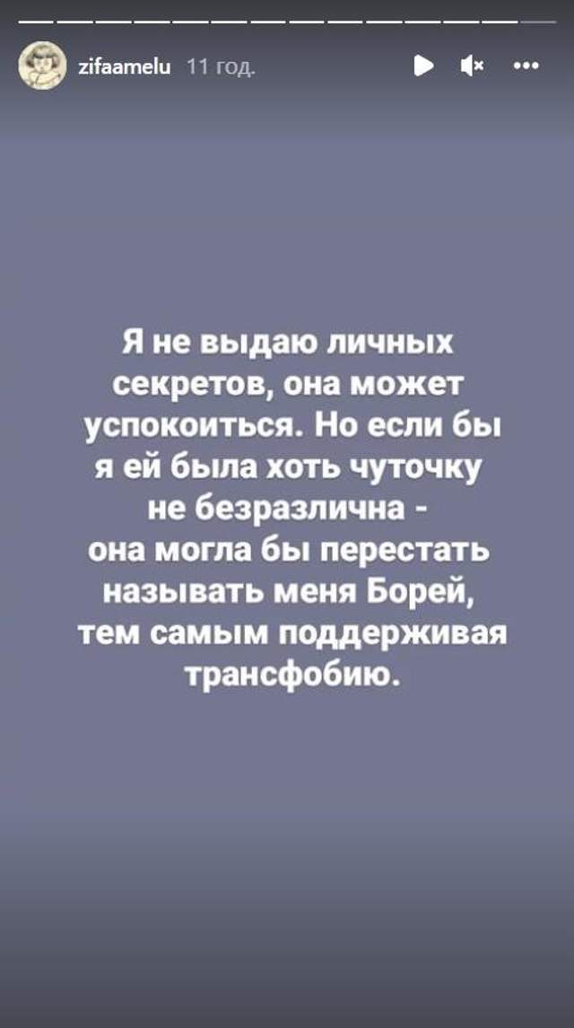 Після перерви Zi Faamelu повернулась у соцмережі та опублікувала кілька інстаграм-сторіс, де звинуватила продюсерів і артистів у несправедливості та знущаннях. Артистка, яка раніше мала псевдонім Зіанджа, зокрема поділилась, що Могилевська досі називає її Борисом, хоча та вже давно позиціонує себе як жінка. Хоч вона нещодавно зізналась, що не змінювала стать, проте переконана, що таким чином Могилевська пропагує трансфобію.
