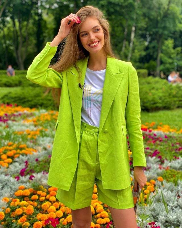 Дівчина позувала на камеру в лляному костюмі, що чудово підійшов для спекотної літньої погоди. Вбрання складалося з широких шортів і подовженого піджака, під який Олександра одягнула білу футболку з принтом.
