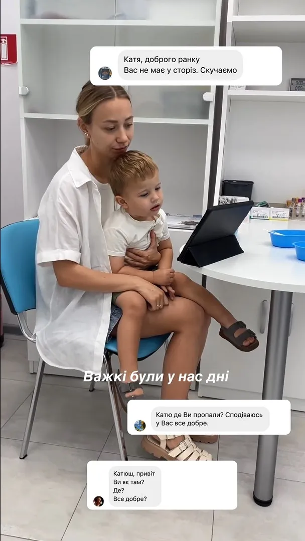 Катерина Репяхова з сином відвідала одну зі столичних клінік, де пережила неприємний досвід. У хлопчика марно намагалися взяти кров з вени без катетера, призначили безліч дорогих аналізів та залякали дивними припущеннями, хоч у виписці написано лиш "затримка психомовленнєвого розвитку". Зіркова дружина припустила, що так лікарі хочуть заробити на пацієнтах. Вона продовжить працювати над здоров'ям сина, але більш поступово.