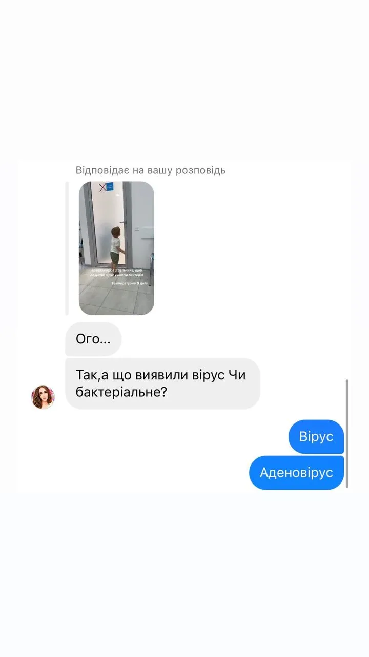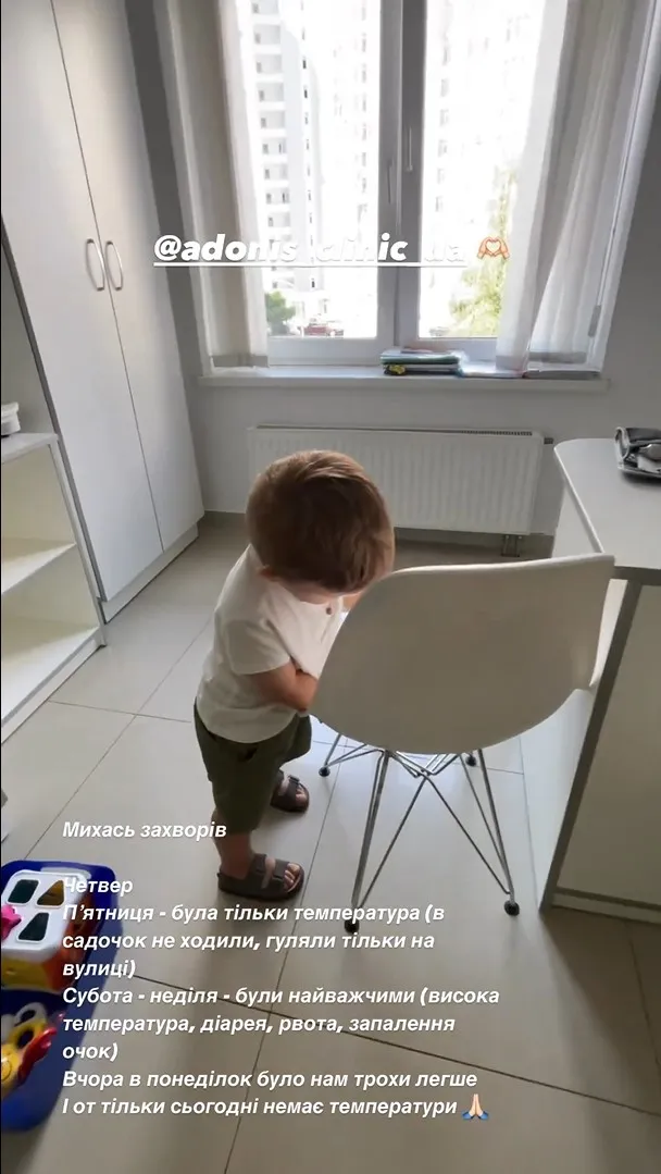 "Здавали кров з пальчика, щоб розуміти, вірус у нас, чи бактерія. Температурив 5 днів", – додала Катерина. Виявилося, що Михайлик підхопив аденовірус – це віруси, що спричиняють гострі респіраторні захворювання.