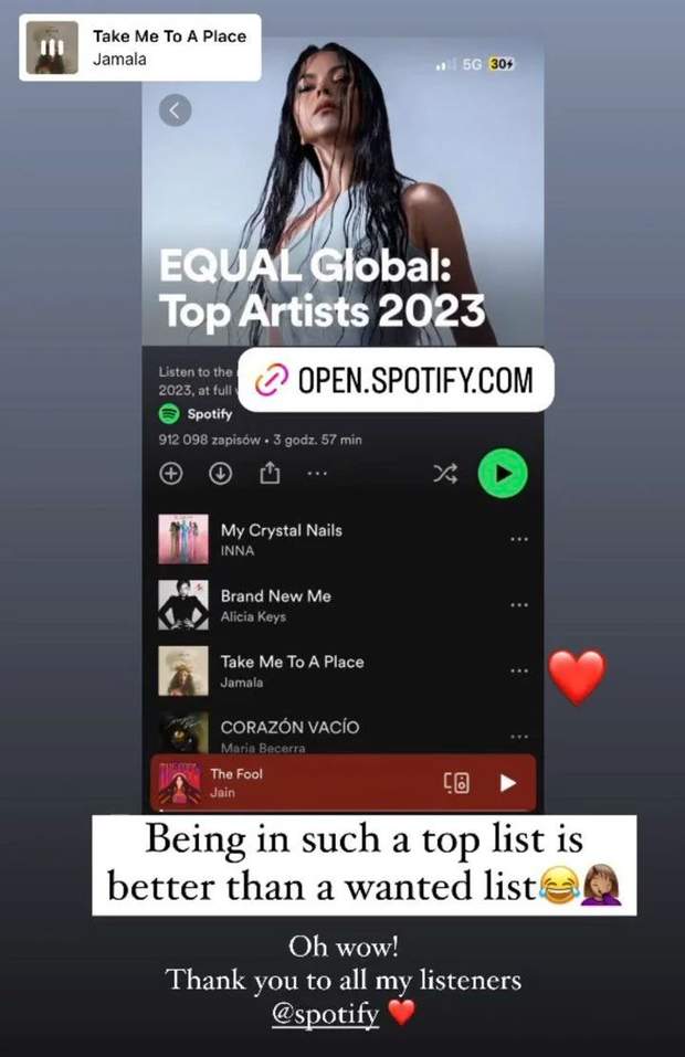 Цікаво, що у березні 2023 року Джамалі вдалося стати першою амбасадоркою з України у добірці EQUAL на Spotify. Такий плейлист слухають у 187 країнах світу, у тому числі й в Україні.