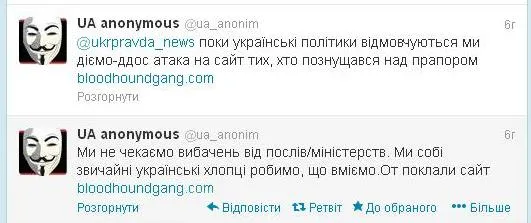 "Поки українські політики відмовчуються, ми діємо ддос-атакою на сайт тих, хто познущався над прапором. Ми не чекаємо вибачень від послів і міністерств. Ми звичайні українські хлопці, робимо, що вміємо. Ось поклали сайт", - йдеться в повідомленні.