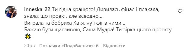 - "Ти гідна кращого! Дивилася фінал і плакала, знала, що проєкт, але все одно. Виграла та бобриха Катя, ну й нехай. Бажаю бути щасливою, Сашо Мудра! Ти зірка цього проєкту!"