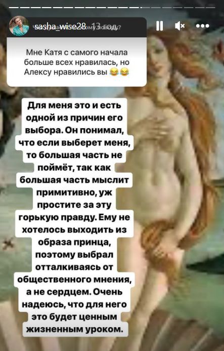 Саша Мудра висловивлася про розрив Алекса та Каті в інстаграм-сторіс. Дівчина припустила, що "Холостяк" не обрав її у фіналі, оскільки розумів, що більшість глядачів "мислять примітивно". На думку Мудрої, Топольському не хотілося виходити з образу принца, тому обрав, відштовхуючись від громадської думки, а не серцем.