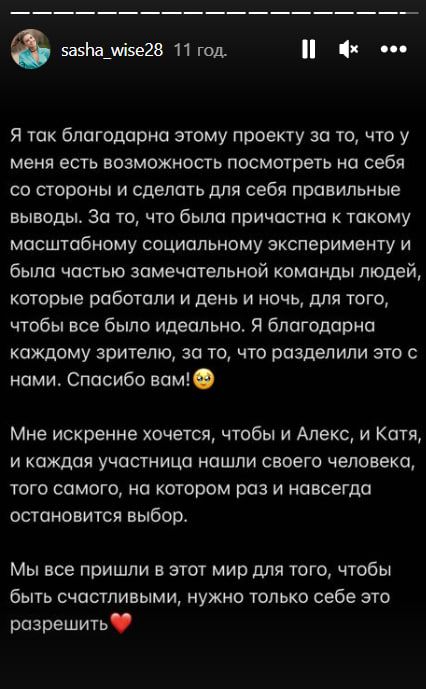 Під час останньої зустрічі Саша подякувала "Холостяку" за його вибір. Попри те, що їй було прикро, вона не тримає зла на Алекса: "Не знаю, що в нього було з Катею, це не моя справа. Але знаю, що було в нас. Мені ніколи не хотілося перетворювати наші побачення на щось важке. Моїм завданням було дати йому легкість і турботу, пристрасть".