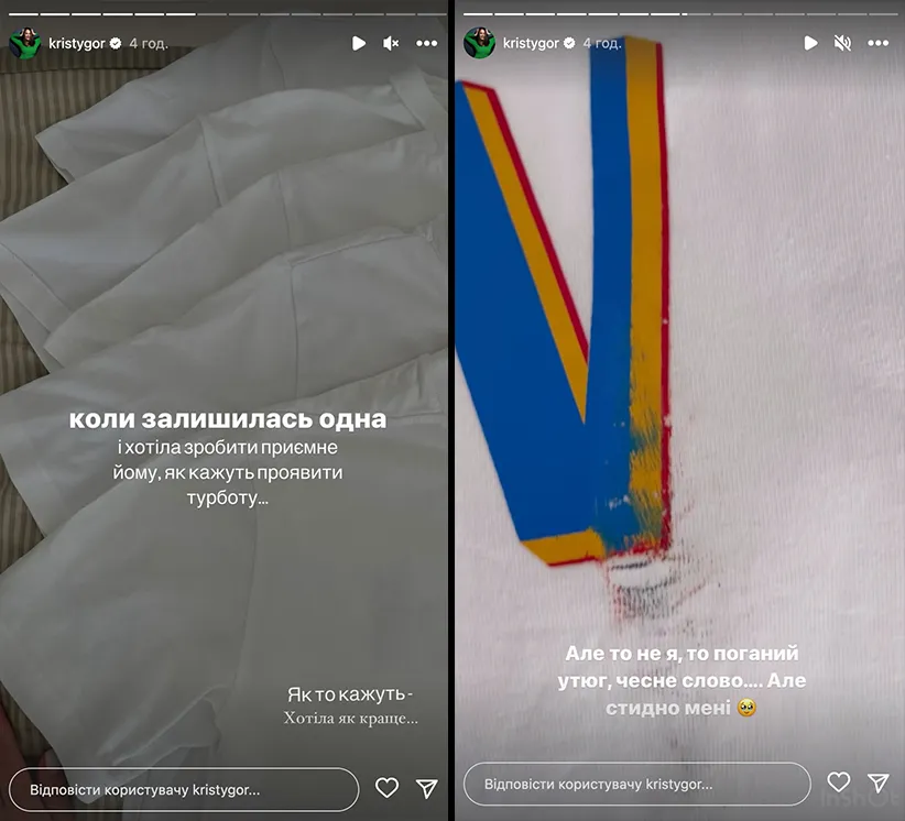 Так, в Інстаграм-сторіс Горняк повідомила, що вирішила проявити турботу до бойфренда. Ідея полягала в тому, що попрасувати "його" футболки. Проте через "погану праску" вона зіпсувала одну з них – фарба від напису перейшла на білу тканину.