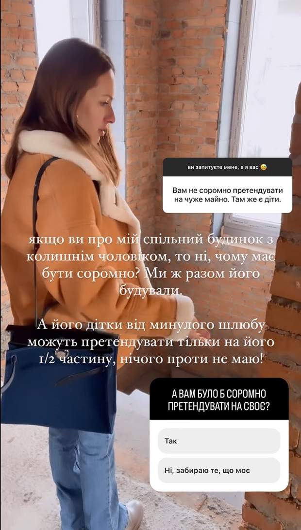 Якщо ви про мій спільний будинок з колишнім чоловіком, то ні, чому має бути соромно? Ми ж разом його будували. А його дітки від минулого шлюбу можуть претендувати тільки на його 1/2 частину, нічого проти не маю!