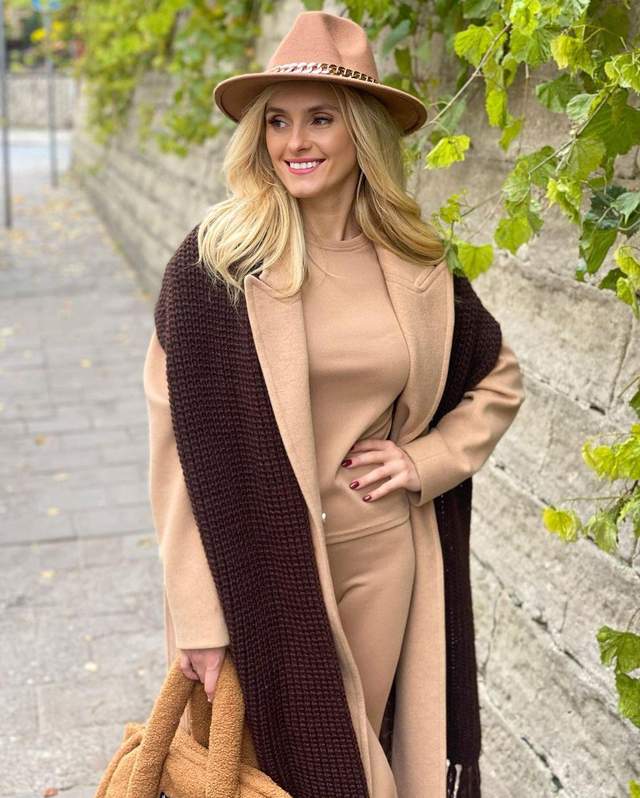 Стильний осінній аутфіт Федишин довершила аксесуарами: шарфом, капелюхом і сумкою. Біляве волосся вона, як завжди, вклала у локони, а на обличчі зробила макіяж з коричневими тінями на повіках і ніжно-рожевою помадою на губах.