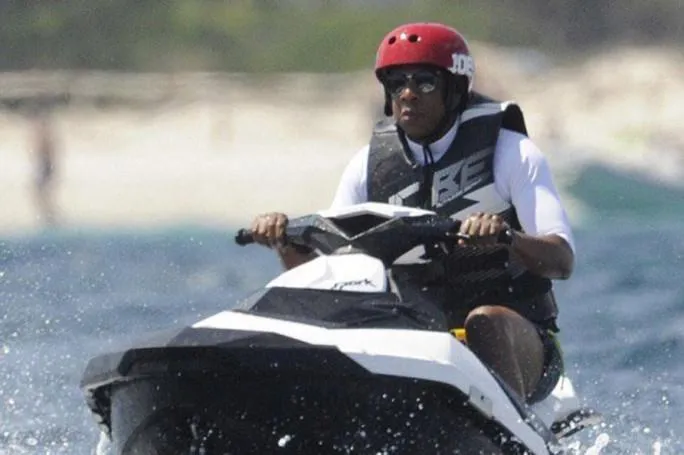 Схоже, водні розваги зовсім не до душі Jay-Z, оскільки фанати підняли старе фото з просторів мережі і побачили його "нещасливий вираз обличчя". І справді, його лице виглядає настільки серйозним, що воно повинно колись було стати темою для жартів. Виконавець мчить по воді на гідроциклі, на ньому рятувальний жилет і шолом, а вигляд у нього дуже напружений та зосереджений.