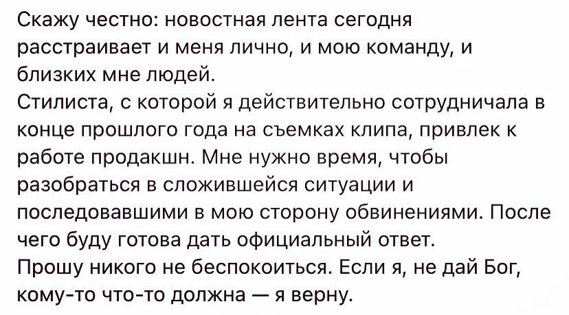 Стилістку, з якою я справді співпрацювала наприкінці минулого року на зйомках кліпу, залучив до роботи продакшн. Мені треба час, щоб розібратися в ситуації і звинуваченнях. Якщо я, не дай Боже, комусь щось винна, я поверну,