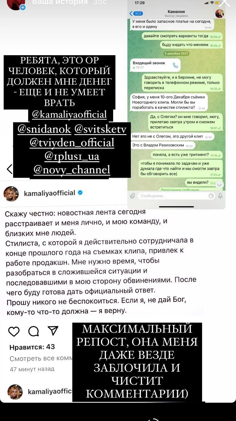 Співачка написала, що "новинна стрічка" засмутила і її, і команду, і близьких. Вона не стала заперечувати, що Софія шила костюм для її кліпу, але заявила, що наймав її продакшн, який і мав би розрахуватися за роботу. Камалія пообіцяла розібратися в ситуації і повернути гроші, якщо дійсно їх заборгувала.