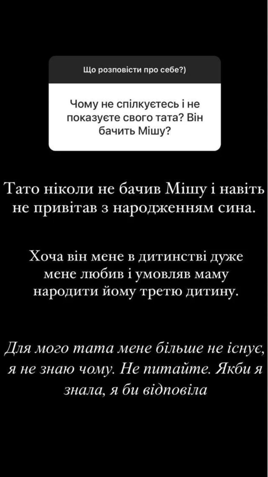 Тато ніколи не бачив Мішу і навіть не привітав із народженням сина. Хоча в дитинстві він мене дуже любив і вмовляв маму народити йому третю дитину. Для мого тата мене більше не існує, я не знаю чому. Не питайте, якби я знала, то відповіла б,