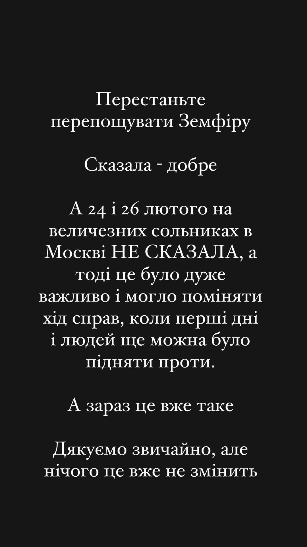 Перестаньте перепощувати Земфіру. Сказала – добре. А 24 і 26 лютого на величезних сольниках у Москві не сказала. А тоді це було дуже важливо і могло поміняти хід справ, коли перші дні людей ще можна було підняти проти. А зараз це вже таке. Дякуємо, звичайно, але нічого це вже не змінить,