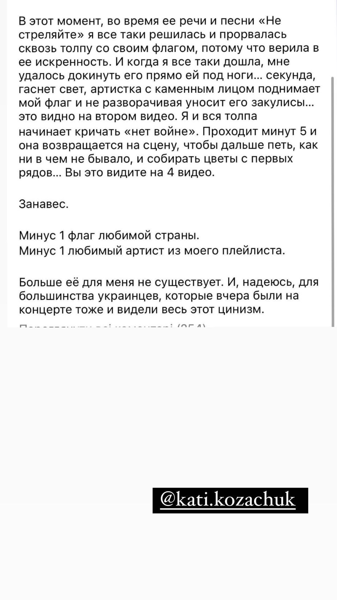 "Секунда, гасне світло, артистка з кам'яним лицем підіймає мій прапор і не розвертаючись заносить його за куліси. Я і весь натовп починає кричати "ні війні". Проходить хвилин 5 і вона повертається на сцену, щоб далі співати, як ні в чому не бувало, і збирати квіти з перших рядів. Завіса. Мінус 1 прапор улюбленої країни. Мінус 1 улюблений артист з мого плейлиста. Більше її для мене не існує", – додала вона.