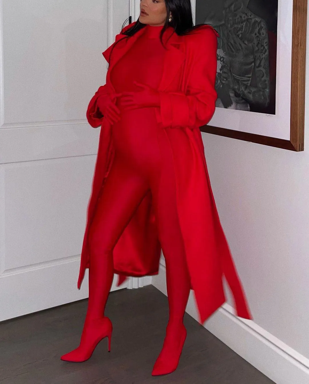 Для прогулянки Кайлі обрала червоний комбінезон на довгий рукав з горловиною, який також переходив у червоне взуття. Поверх нього зіркова матуся одягнула розкішне червоне пальто максідовжини і теплі червоні рукавиці. Свій total red look вона доповнила акцентною сумочкою такого ж кольору з принтом "далматинця".