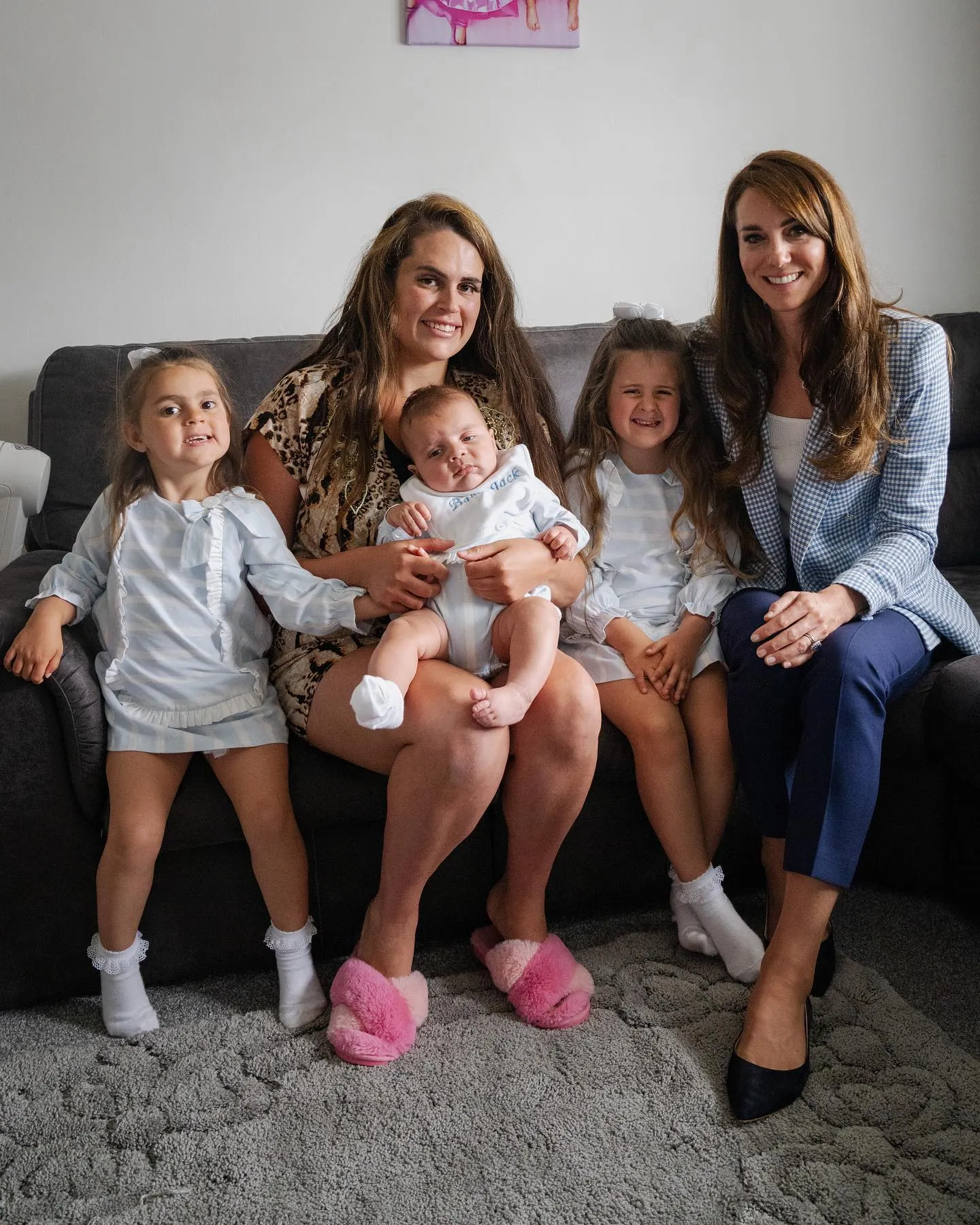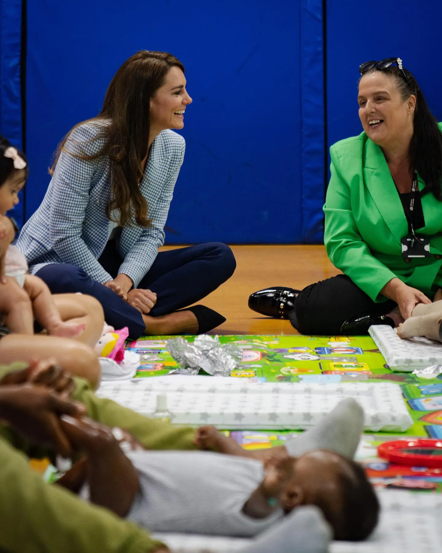 У сімейному центрі Windsor Family Hub принцеса Уельська з'явилася в ситцевому двобортному жакеті від Zara з блакитним принтом "гусячі лапки". Під піджак вона одягла темно-сині крепові штани з високою талією. Замість своїх фірмових туфель на підборах Кейт Міддлтон підібрала пару темно-блакитних замшевих балеток на плоскій підошві. Це взуття від одного з її улюблених брендів Emmy London.