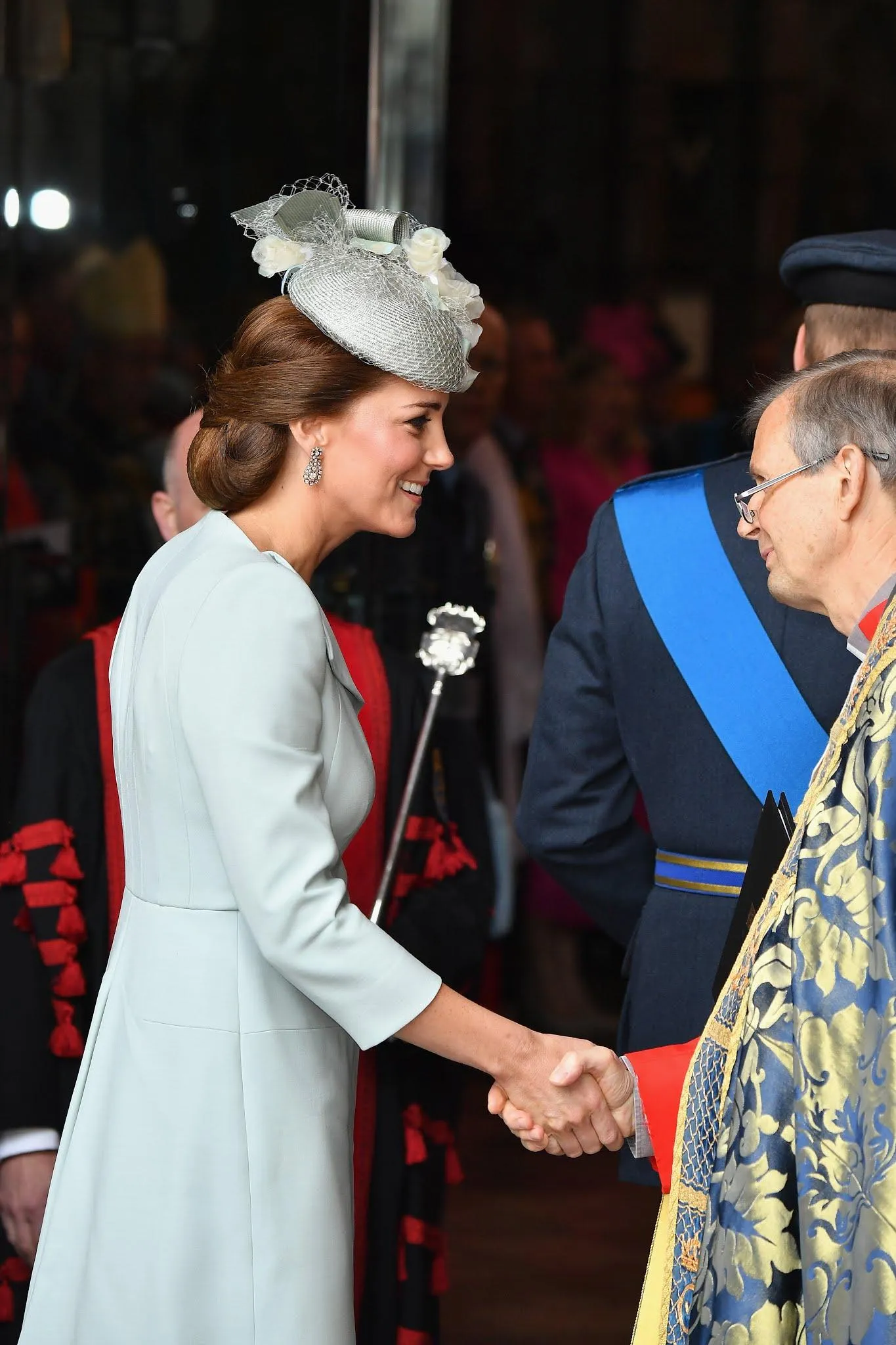 Кетрін обрала ніжно-блакитне пальто від улюбленого бренду Alexander McQueen, яке прикрасила дорогоцінною брошкою і доповнила образ капелюшком Sean Barrett.