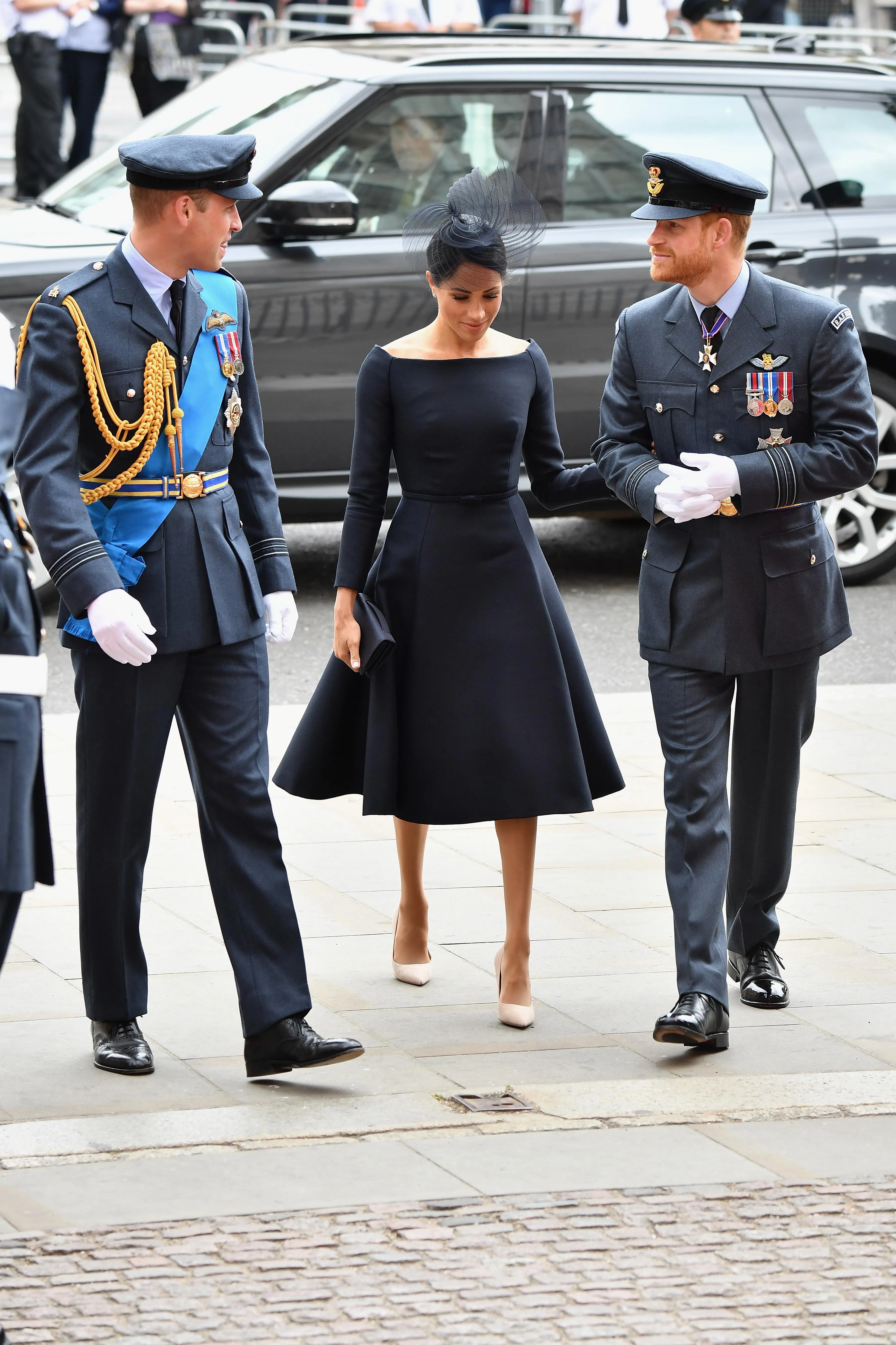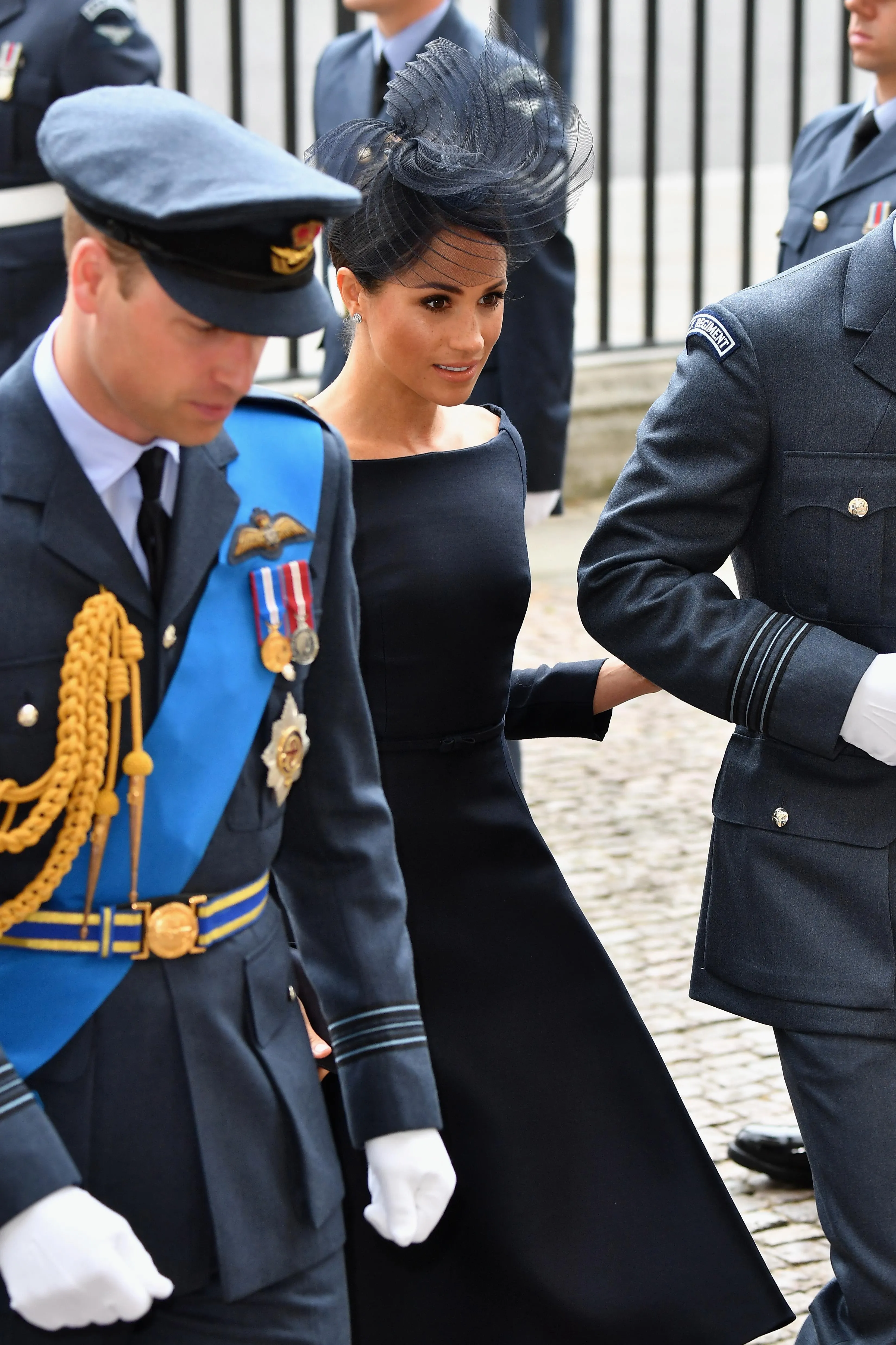Меган Маркл в той же час обрала класичну строгу сукню темно-синього кольору від Dior з фірмовим вирізом-човником, яку доповнила капелюшком від Stephen Jones. У двох герцогинь були бежеві туфлі на підборах та стильні клатчі кольору металік в Кейт і темно-синій клатч у Меган.