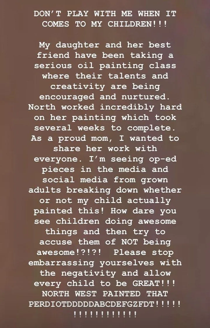 Зіркова матуся була обурена такою кількістю негативних коментарів. Кім у відповідь оприлюднила ще одне сторіс, де написала: "Не грайте зі мною, коли справа стосується моїх дітей!". Вона наголосила, що Норт ходить з найкращою подругою на уроки живопису олійними фарбами.