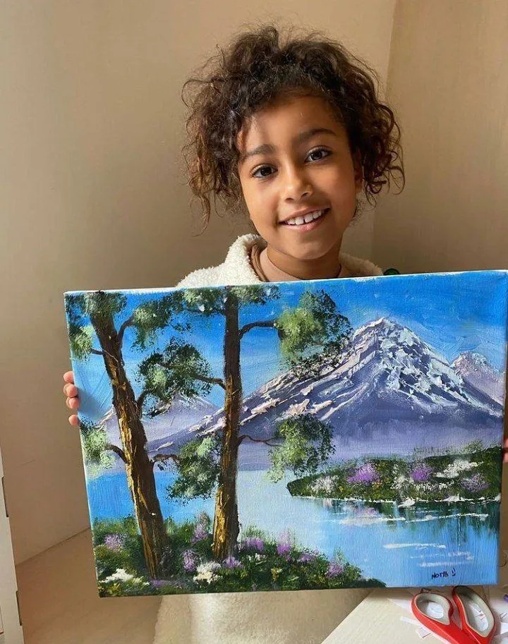 Знаменитість в інстаграмі оприлюднила фото, на якому була зображена картина, яку намалювала її донька Норт. Зіркова матуся назвала її "маленькою художницею". На картині зображений гарний пейзаж, виконаний в стилі відомого американського художника Бобба Росса, який записав безліч відеоуроків.