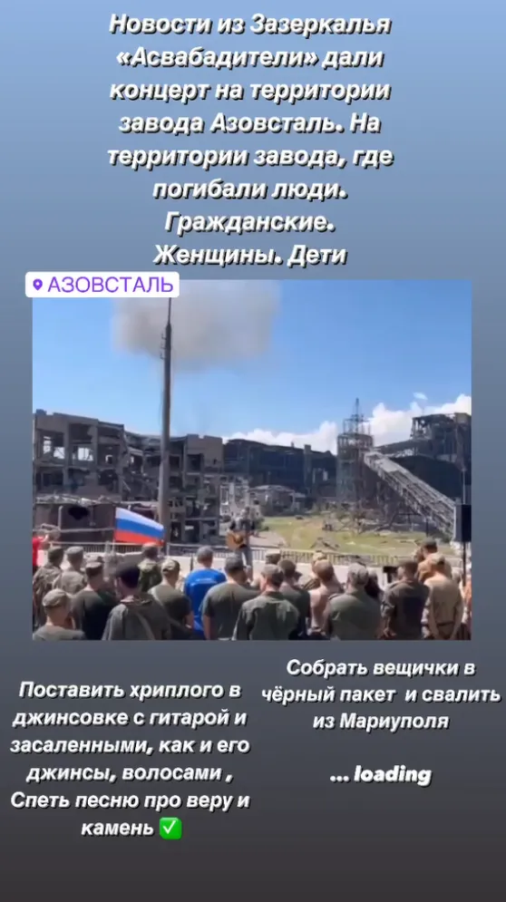 Новини з Задзеркалля. "Асвабадітєлі" дали концерт на території заводу "Азовсталь". На території заводу, де гинули люди. Цивільні. Жінки. Діти,